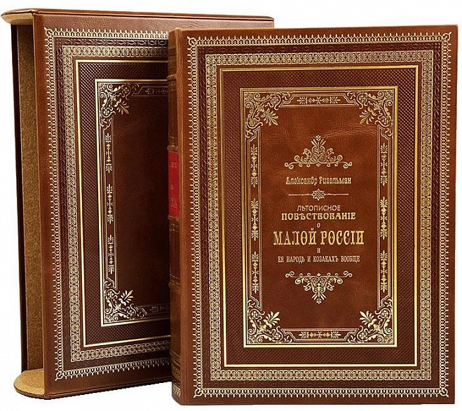 Летописное повествование о малой России ( в футляре) АННОТАЦИЯ Одна из первых попыток создания систематизированной истории Малороссии, работа Ригельмана во многом компилятивная. Автор обильно цитирует и пересказывает летописи, хроники и работы своих предшественников, часто не указывая источники. Вместе с тем в книге приводятся полные тексты множества важных исторических документов. Примечательно также описание быта и нравов казаков, составленное на основе записанных автором традиционных преданий. Иллюстрации из этого издания до сих пор считаются хрестоматийными изображениями народных малороссийских костюмов. ОПИСАНИЕ Уникальное репринтное издание, переплетено вручную из высококачественной кожи растительного дубления производства Италии. Окрашенный в тон переплетного материала обрез. Классическая стилистика переплета, с сочетанием блинтового и золотого тиснения. Высококачественная дизайнерская бумага. Дублюра. Кожаный подарочный футляр. Книга представлена в оригинальном подарочном коробе, перчатки и, по желанию, сертификат (может быть именным) в комплекте. Цветовое сочетание переплёта и упаковки может отличаться от представленных на фото.