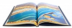 Переплёт ручной работы из натуральной кожи. Форзац из дизайнерской бумаги. 4 бинта на корешке, ручной обработки. Каптал золотой из натуральной кожи. Обрез блока торшонированный золотой. Тиснение блинтовое и золотой фольгой. Ляссе. Вес 1550г