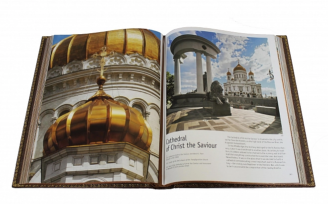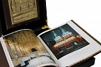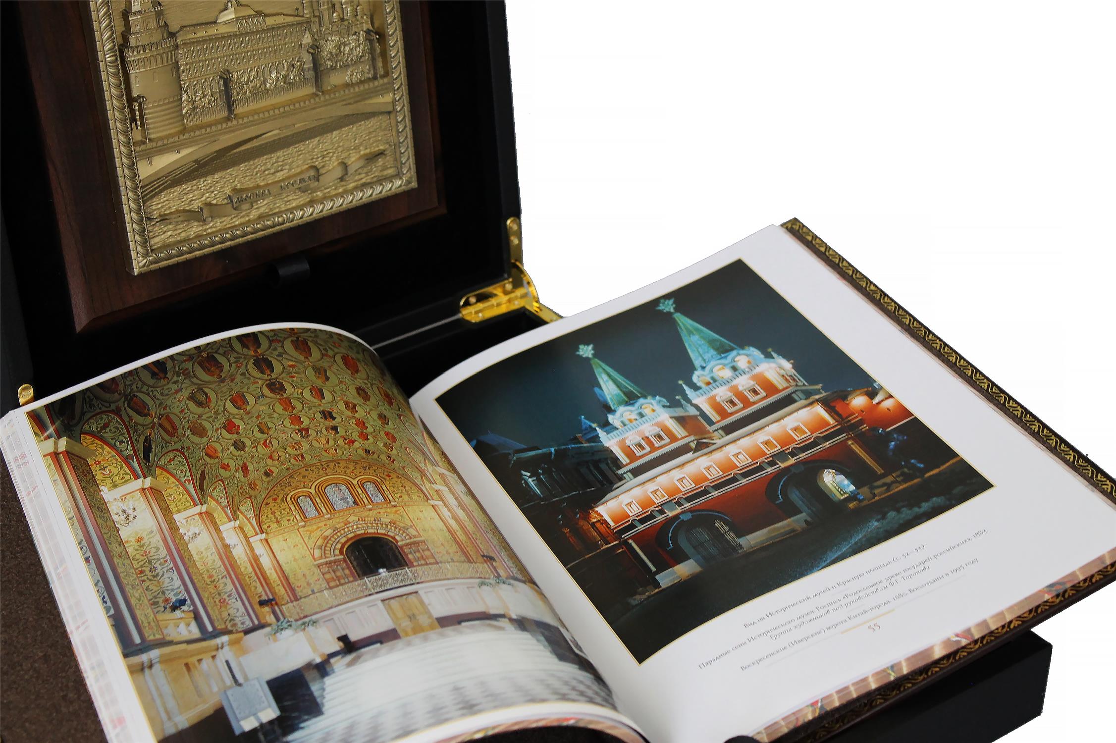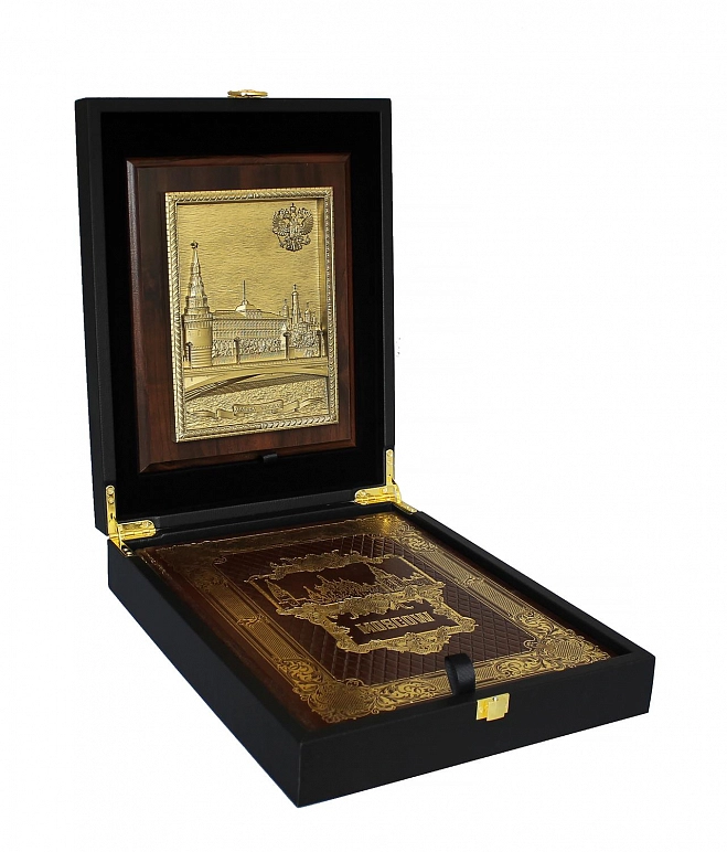 Оригинальный подарочный набор включает в себя книгу в кожаном переплете "Москва" и плакетку, оформленных в деревянной коробке, обтянутой кожей. Дизайн издания представлен сочетанием блинтового и золотого тиснения. Крашеный обрез. Богато оформленные дублюрами форзацы, шелковое ляссе. Альбом отпечатан на мелованной бумаге. Плакетка изготовлена из литьевого пластика в сочетании с деревянной основой.
