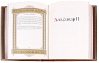 Цельнокожаный переплёт ручной работы, украшен золотым и блинтовым тиснением. Корешок декорирован бинтами. Текст книги напечатан на бумаге Munken Print Cream Шведского производства и дополнен цветными иллюстрациями. Обрез оформлен художественным изображением. Ляссе из шёлковой ленты. Форзац цельный из дизайнерской бумаги. Дублюра окатана золотом.