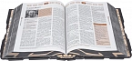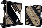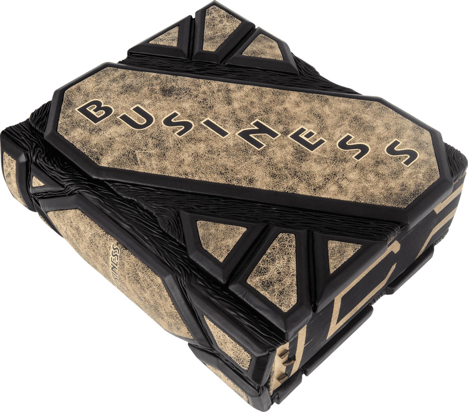 Составной переплет «Брадель», ручной работы, изготовлен из комбинации натуральных кож «Marronezegna» и «Robbat Nero» производства итальянской кожевенной фабрики «Motta Alfredo». Обложка книги и футляр уникальной авторской архитектуры оформлены высоким рельефом, объемной помятостью кожи и декорированы золотым и черным тиснением (использована фольга «Luxor 240»). Обрез книги вручную полирован и декорирован комбинацией позолоты и черной фольги.