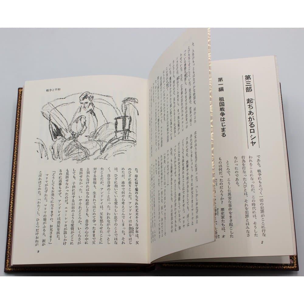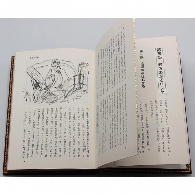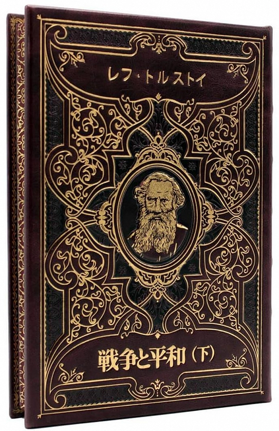 «Война и мир» − классика русской литературы на японском языке в футляре. Исторический роман Льва Толстого «Война и мир» на японском языке. Книга ориентированы на классическое японское чтение сверху вниз и справа налево. Удивительные книги с интересными иллюстрациями в коже винного цвета.