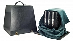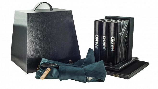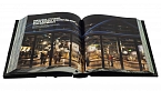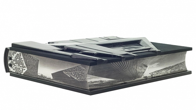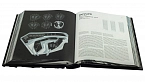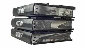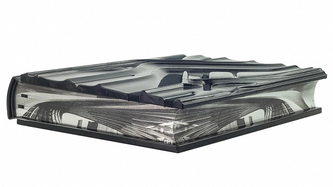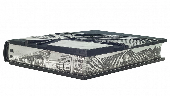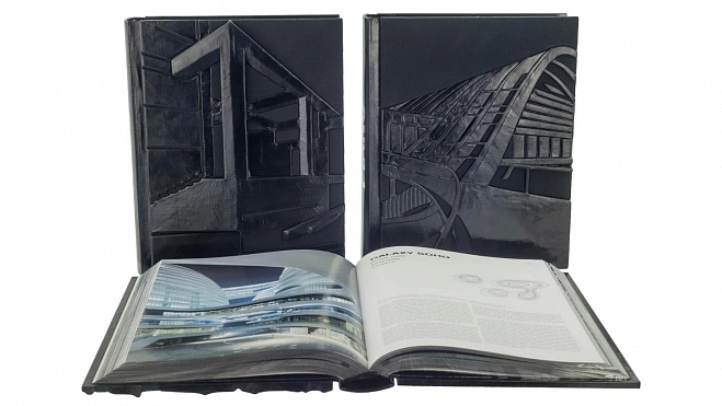 Составной переплет «Брадель» ручной работы, выполнен из натуральной кожи «Nero» производства итальянской кожевенной фабрики «Carisma». Обложки книг многоуровневые, сложной архитектуры, оформлены рельефным серебряным тиснением, с использованием фольги «Luxor 240». Обрезы книжных блоков выполнены в авторской технике серебрения с нанесением репродукций.