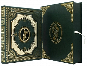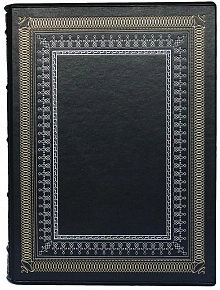 Дизайн представлен оригинальным сочетанием блинтового и золотого тиснения, выполненных на высококачественной натуральной коже, а также богато оформленными дюблюрами составными форзацами. Крашенный в тон переплетного материала обрез, ляссе из шелковой ленты.