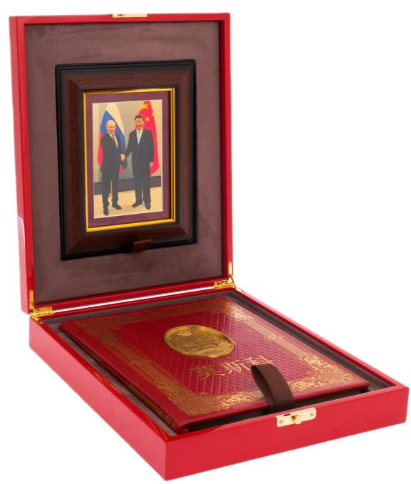 В центре набора — книга, обрамлённая в роскошную красную кожаную обложку, декорированную золотыми узорами и медальоном с изображением Кремля. Этот глубокий алый оттенок, столь близкий традициям Китая, переплетается с золотом, символизируя благополучие, могущество и культурное наследие. Книга на китайском языке подробно рассказывает о биографиях Владимира Путина и Си Цзиньпина, чьи жизненные пути стали примером выдающегося лидерства и политической прозорливости.