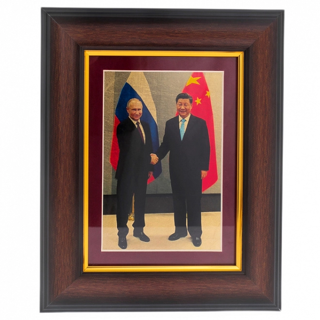 В набор входит и изысканная фотография в деревянной рамке, увековечивающая момент исторической встречи двух лидеров на фоне флагов своих держав. Этот портрет, словно застывший миг дипломатического диалога, становится напоминанием о единстве и сотрудничестве, оказывающих влияние на будущее поколений.