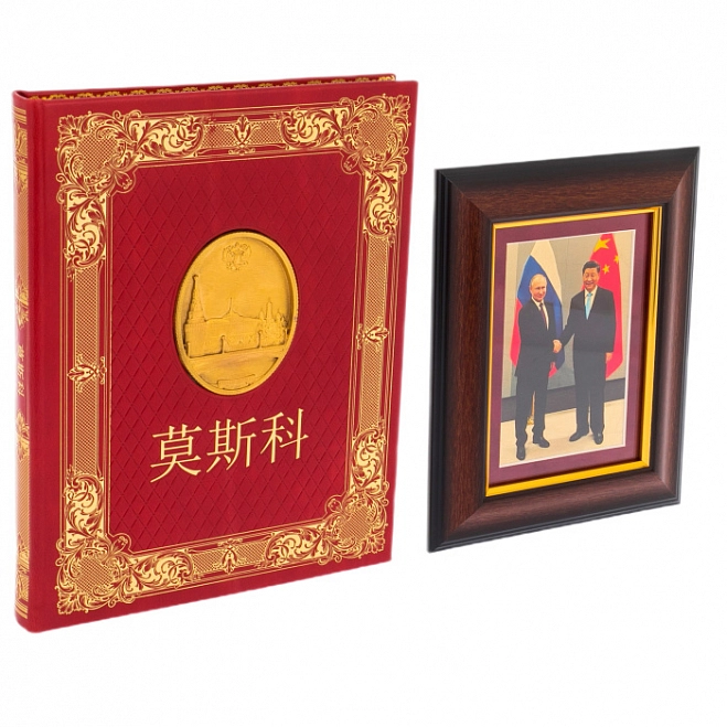 Подарочный набор "Москва" с книгой и картиной "Путин и Си Цзиньпин" в лакированной шкатулке, на китайском языке