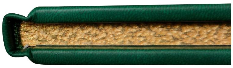 Переплет ручной работы. Натуральная переплетная кожа. Каптал из шелковых нитей. Ляссе шелковое. Обрез торшонированный золотой фольгой. Украшение переплета: тиснение полиграфической фольгой.