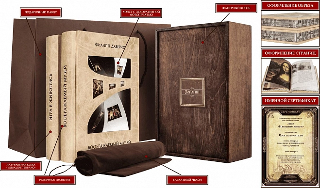 Подарочные книги "Воображаемый музей", "Игра в живопись" Филипп Даверио. АННОТАЦИЯ «Воображаемый музей» Автор книги Филипп Даверио – искусствовед с мировым именем – рассказывает о живописных полотнах и прочих произведениях искусства, словно размещая их в своем воображаемом музее. Как известный знаток и любитель живописи, он учит читателей подмечать мельчайшие подробности: особенности живописных техник, интересные, а иногда и загадочные детали, рассказывает о событиях, изображенных на той или иной картине. «Игра в живопись» В этой книге собраны краткие истории о жизни и творчестве всемирно известных мастеров живописи XIII-XX веков. При этом автор не пытается читать скучную лекцию, он только приоткрывает окно в мир изобразительного искусства, показывая жизнь художников и их произведения такими, какие они есть: серьезными и легкомысленными, странные и непонятными. При этом каждая такая история насыщена лирическими отступлениями и богато проиллюстрирована репродукциями знаменитых и малоизвестных художественных полотен. Книга «Игра в живопись» продолжает серию книг об изобразительном искусстве, где первой вышла книга «Воображаемый музей». ОФОРМЛЕНИЕ Составной переплет «Брадель» ручной работы, выполнен из натуральной кожи «Vebsalide terpano» производства кожевенной итальянской фабрики «Claudio». Обложки оформлены вставками из холста с художественной фотопечатью и рельефным золотым тиснением, с использованием золотой фольги «Luxor 240». Обрезы книг выполнен в авторской технике золочения с нанесением репродукций. Персональный сертификат с индивидуальным текстом поздравления. Бархатный мешочек. Деревянная коробка. Общее количество страниц – 808 стр. (офсетная бумага, цветная печать) Формат – 180х250х48 мм. Вес комплекта – 2,6 кг. Готовая книга может отличаться от представленной на фото.
