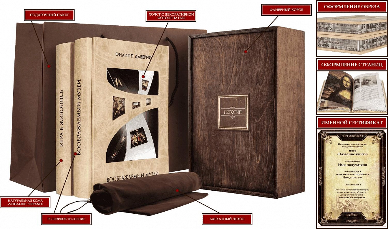 Подарочные книги "Воображаемый музей", "Игра в живопись" Филипп Даверио. АННОТАЦИЯ «Воображаемый музей» Автор книги Филипп Даверио – искусствовед с мировым именем – рассказывает о живописных полотнах и прочих произведениях искусства, словно размещая их в своем воображаемом музее. Как известный знаток и любитель живописи, он учит читателей подмечать мельчайшие подробности: особенности живописных техник, интересные, а иногда и загадочные детали, рассказывает о событиях, изображенных на той или иной картине. «Игра в живопись» В этой книге собраны краткие истории о жизни и творчестве всемирно известных мастеров живописи XIII-XX веков. При этом автор не пытается читать скучную лекцию, он только приоткрывает окно в мир изобразительного искусства, показывая жизнь художников и их произведения такими, какие они есть: серьезными и легкомысленными, странные и непонятными. При этом каждая такая история насыщена лирическими отступлениями и богато проиллюстрирована репродукциями знаменитых и малоизвестных художественных полотен. Книга «Игра в живопись» продолжает серию книг об изобразительном искусстве, где первой вышла книга «Воображаемый музей». ОФОРМЛЕНИЕ Составной переплет «Брадель» ручной работы, выполнен из натуральной кожи «Vebsalide terpano» производства кожевенной итальянской фабрики «Claudio». Обложки оформлены вставками из холста с художественной фотопечатью и рельефным золотым тиснением, с использованием золотой фольги «Luxor 240». Обрезы книг выполнен в авторской технике золочения с нанесением репродукций. Персональный сертификат с индивидуальным текстом поздравления. Бархатный мешочек. Деревянная коробка. Общее количество страниц – 808 стр. (офсетная бумага, цветная печать) Формат – 180х250х48 мм. Вес комплекта – 2,6 кг. Готовая книга может отличаться от представленной на фото.