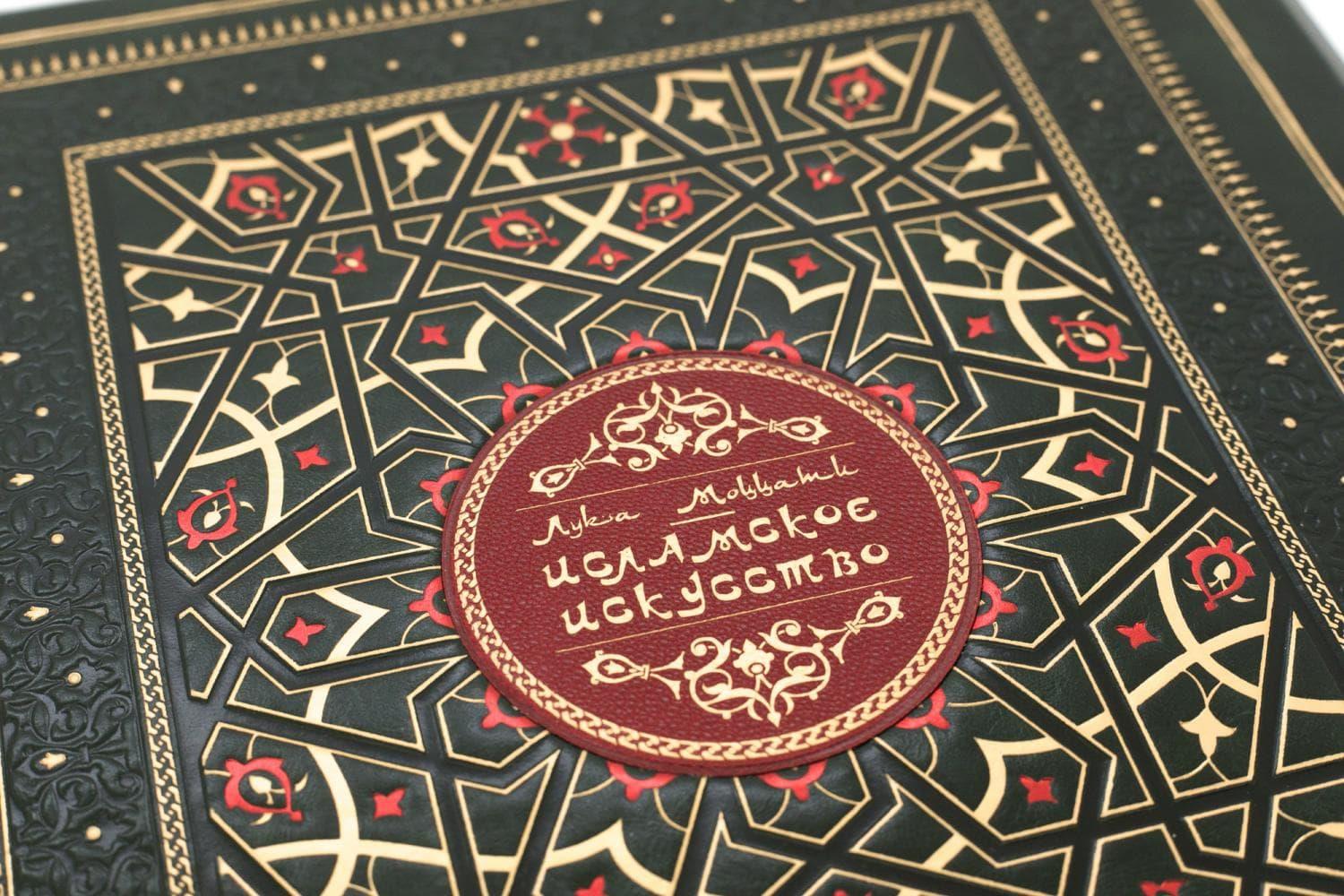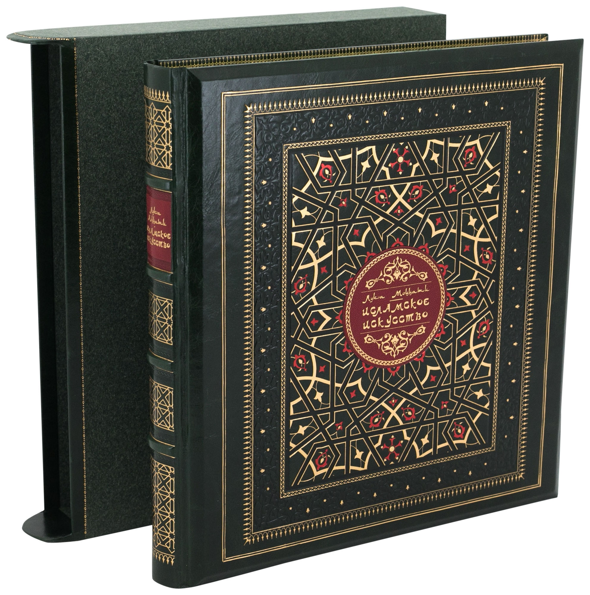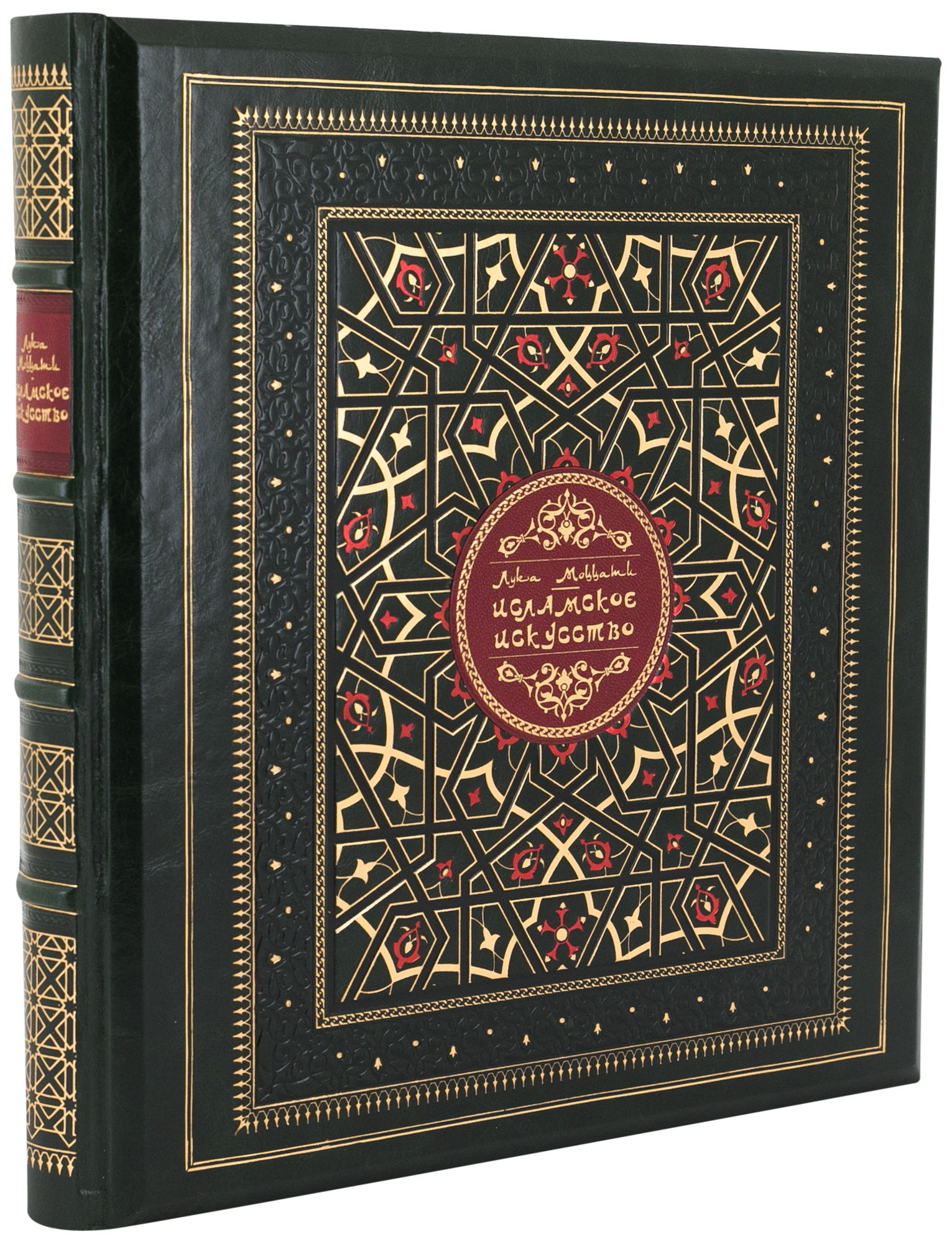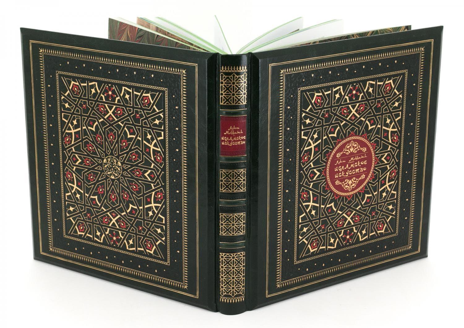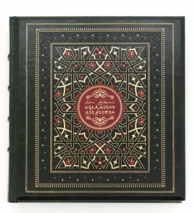 Подарочный альбом в цельнокожаном переплете. Формат 30х30см. Здесь освещены темы архитектуры, живописи, каллиграфии, керамики и других прикладных ремёсел в разрезе национальных искусств исламских государств. Переплет выполнен из натуральной телячьей кожи. Художественное многоцветное тиснение по всей поверхности переплетной крышки. Обрезы с 3-х сторон окрашены и отгравированы вручную. Форзац оформлен мраморной бумагой и бордюрным орнаментом. Для книги изготовлен индивидуальный футляр с кожаной окантовкой.