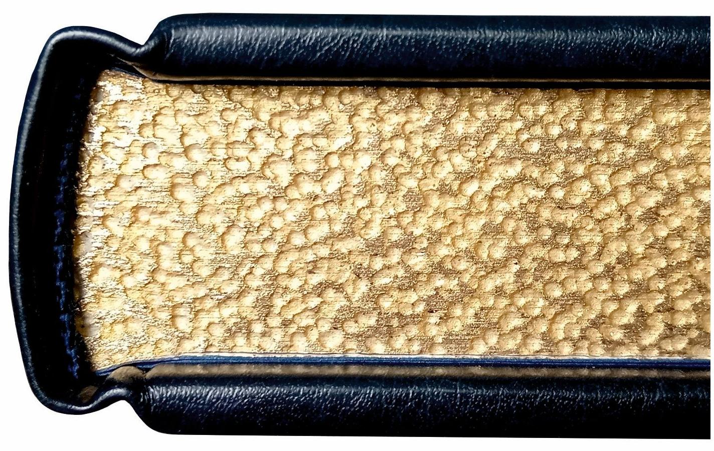 Переплет ручной работы. Натуральная переплетная кожа. Каптал из шелковых нитей. Ляссе шелковое. Обрез торшонированный золотой фольгой. Украшение переплета: тиснение полиграфической фольгой, полиграфическая ламинированная вставка.