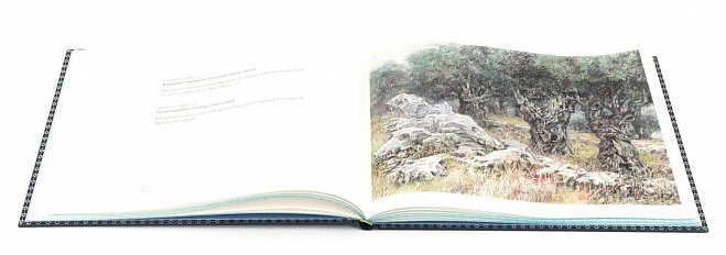 Коллекционное издание. Тираж 88 номерных экземпляров. Москва. Издательство Столяровых. 2020. Альбом украшают прекрасные станковые листы заслуженного художника России Ю.В. Иванова (1940-2019), сделанные им с натуры на Святой земле. Благодаря высоким технологиям печати оригиналы иллюстраций воспроизводятся в точности. Издание посвящено 80-летию художника Ю. Иванова.
