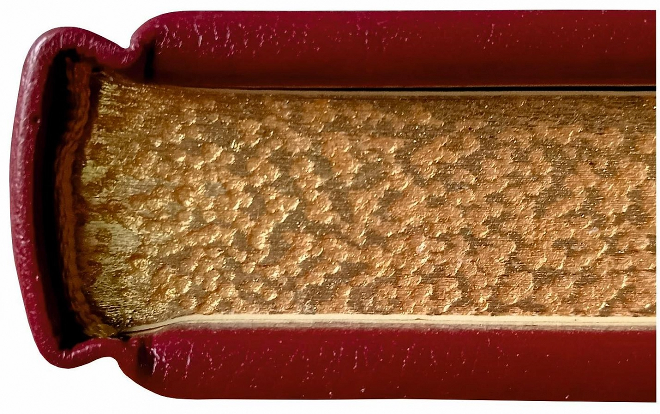 Переплет ручной работы. Натуральная переплетная кожа. Каптал из шелковых нитей. Ляссе шелковое. Обрез торшонированный золотой фольгой. Украшение переплета: тиснение полиграфической фольгой двух цветов.