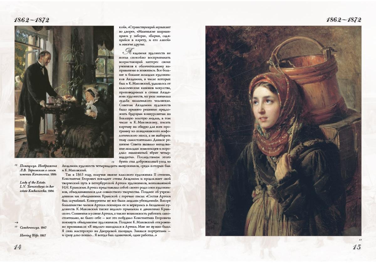 Константин Егорович Маковский (1839–1915) – художник необычной и противоречивой судьбы. Редкий талант, трудолюбие – и большие деньги; участие в знаменитом «бунте четырнадцати» – и звание профессора и академика Академии художеств. Маковский – создатель бесчисленных заказных портретов русской аристократии и в то же время целой галереи образов русских ученых и деятелей культуры, масштабных исторических полотен. Наследие художника еще не изучено и не оценено надлежащим образом. Может быть, замечания некоторых критиков о его стремлении слишком приукрасить действительность и имеют под собой основание. С этим можно спорить. Но нельзя отрицать яркий индивидуальный стиль, особую выразительность и огромное дарование мастера. В этом альбоме – самое полное собрание цветных репродукций (около трех с половиной сотен) произведений Константина Егоровича Маковского.