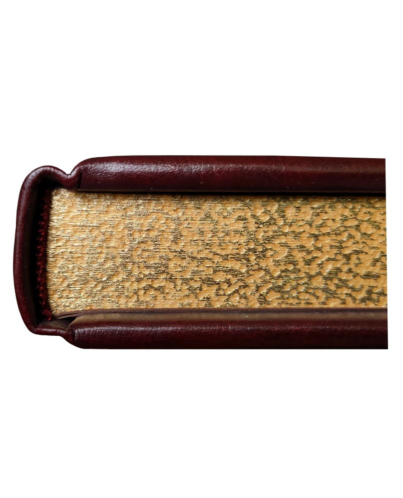 Переплет ручной работы. Натуральная переплетная кожа. Каптал из шелковых нитей. Ляссе шелковое. Обрез торшонированный золотой фольгой. Украшение переплета: тиснение полиграфической фольгой.