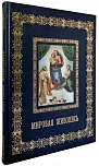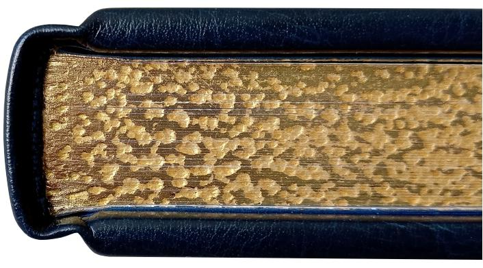 Переплет ручной работы. Натуральная переплетная кожа. Цвет синий. Каптал из шелковых нитей. Ляссе шелковое. Обрез торшонированный золотой фольгой. Украшение переплета: тиснение полиграфической фольгой, полиграфическая вставка.