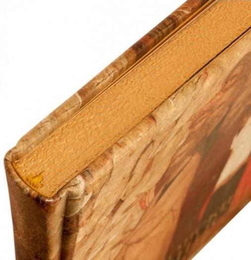 Переплет ручной работы. Натуральная переплетная кожа. Каптал из шелковых нитей. Ляссе шелковое. Обрез торшонированный золотой фольгой. Украшение переплета: тиснение полиграфической фольгой, печать на коже сольвентными чернилами.