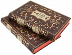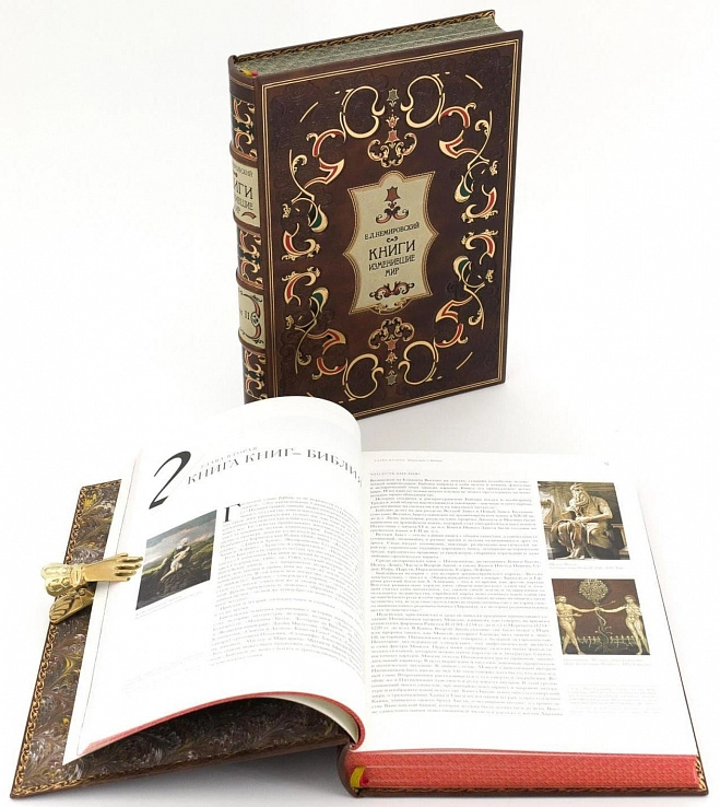 Подарочные книги «Книги, изменившие мир» Немировский Е. Л. в 2-х т. АННОТАЦИЯ Пятигорск. СНЕГ. 2015. Фундаментальный труд о роли книжной культуры в истории человечества. В труде выдающегося ученого-книговеда рассказывается о многих книгах, их авторах, создателях, книгопродавцах и читателях. Особое место уделено истокам книгопечатания – Иоганну Гутенбергу и его последователям, подробно рассматривается Библия, роль которой в мировой культуре беспрецендента, рассмотрены многие античные сочинения. Книга адресована историкам, филологам, культурологам и всем, интересующимся историей книги и книжной культуры. ОФОРМЛЕНИЕ Эксклюзивное исполнение. Книга сделана по старинной французской технологии; Переплет цельнокожаный, из натуральной, застаренной вручную кожи. Художественное тиснение на обложке и корешке с элементами ручной росписи; вставки из кожи другого цвета. Блок сшит на пяти шнурах; форзац выполнен из мраморной бумаги ручного крашения; дублюра окатана вручную 23-каратным золотом; обрез блока с художественным оформлением: окрашен и гравирован вручную; ляссе шелковое, каптал ручного плетения; Индивидуальный футляр.