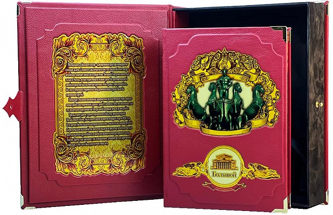 Подарочная книга "Большой" (в коробе) АННОТАЦИЯ Книга издана к открытию Большого театра после десятилетней реконструкции. Дизайнером разработана структура и нейминг русского и английского изданий. В книге пять тематических разделов: «Большой ремонт» — о глубокой модернизации здания, «Большой зритель» — фотоэссе о рядовых и известных посетителях театра, «Большой успех» — раздел по материалам мировой прессы о событиях театра, «Большой стиль» — основной раздел книги: описания и фотографии по всем спектаклям театра со дня открытия, «Большой артист» — фотогалерея звезд, «Большой проект» — статья об истории и архитектуре театрального здания. Для книги проводили фотографирование Питер Линдберг, Жерар Юфера, Владимир Фридкес, Юрий Пальмин, Ольга Алексеенко. Опубликованы сотни прекрасных фотографий из архива Музея Большого театра. Книга разворачивается в обратной хронологической последовательности, от сегодняшнего дня театра и его труппы, к временам, когда его ещё не существовало. Покровная ткань переплёта соткана по рисунку современного занавеса театра из тех самых ниток, на той же фабрике, что и сам занавес. ОПИСАНИЕ Цельнокожаный переплёт ручной работы, украшен иллюстрированной вставкой из цветного металла. Обложка двухуровневая. Металлические уголки дополняют дизайн и сохраняют книгу при использовании. Текст книги напечатан на мелованной бумаге и дополнен цветными иллюстрациями. Обрез оформлен в технике "Перо павлина”. Ляссе из шелковой ленты. Форзац цельный из дизайнерской бумаги. Книга представлена в оригинальном подарочном коробе: перчатки и сертификат (может быть именным) в комплекте. Цветовое сочетание переплёта и упаковки может отличаться от представленных на фото.