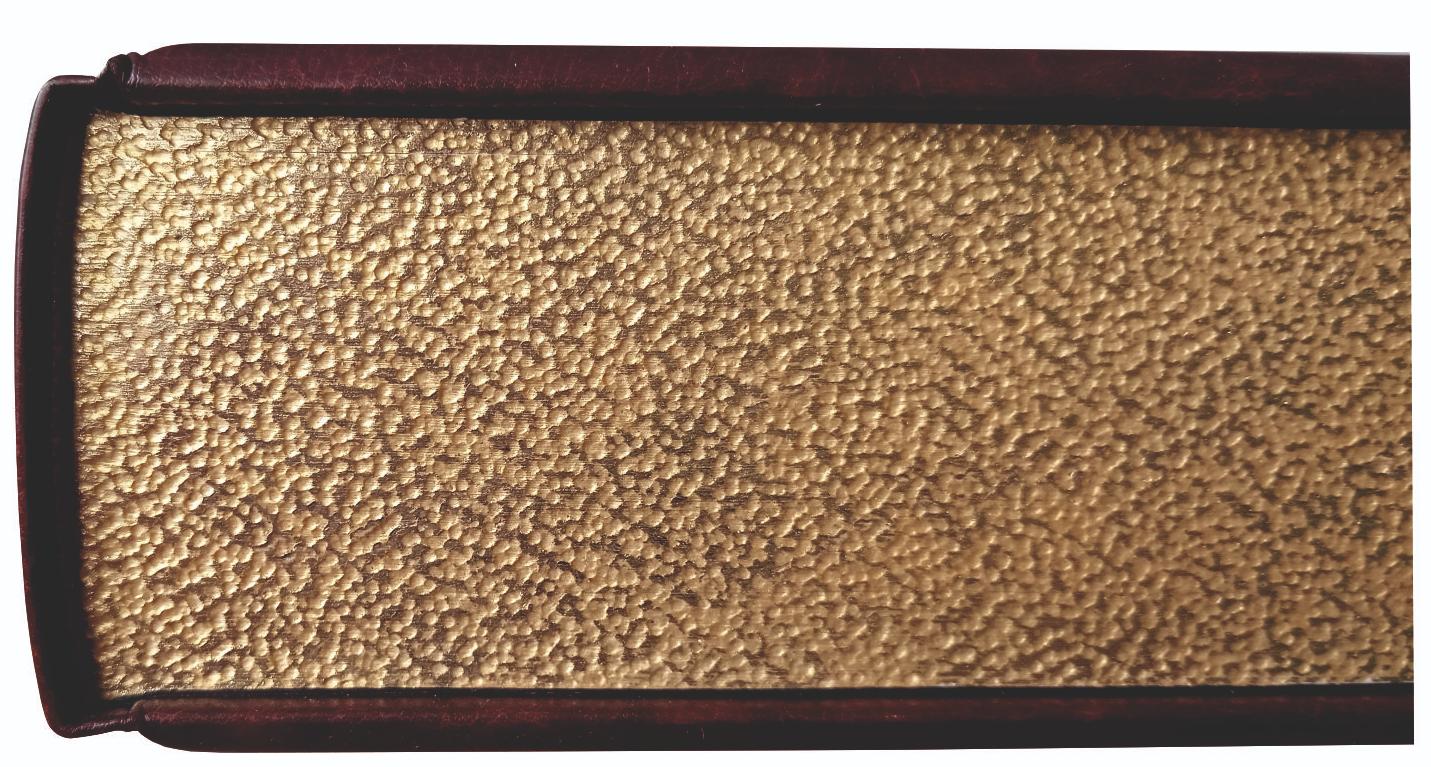Переплет ручной работы. Натуральная переплетная кожа. Каптал из шелковых нитей. Ляссе шелковое. Обрез торшонированный золотой фольгой. Украшение переплета: тиснение полиграфической фольгой, блинтовое тиснение.