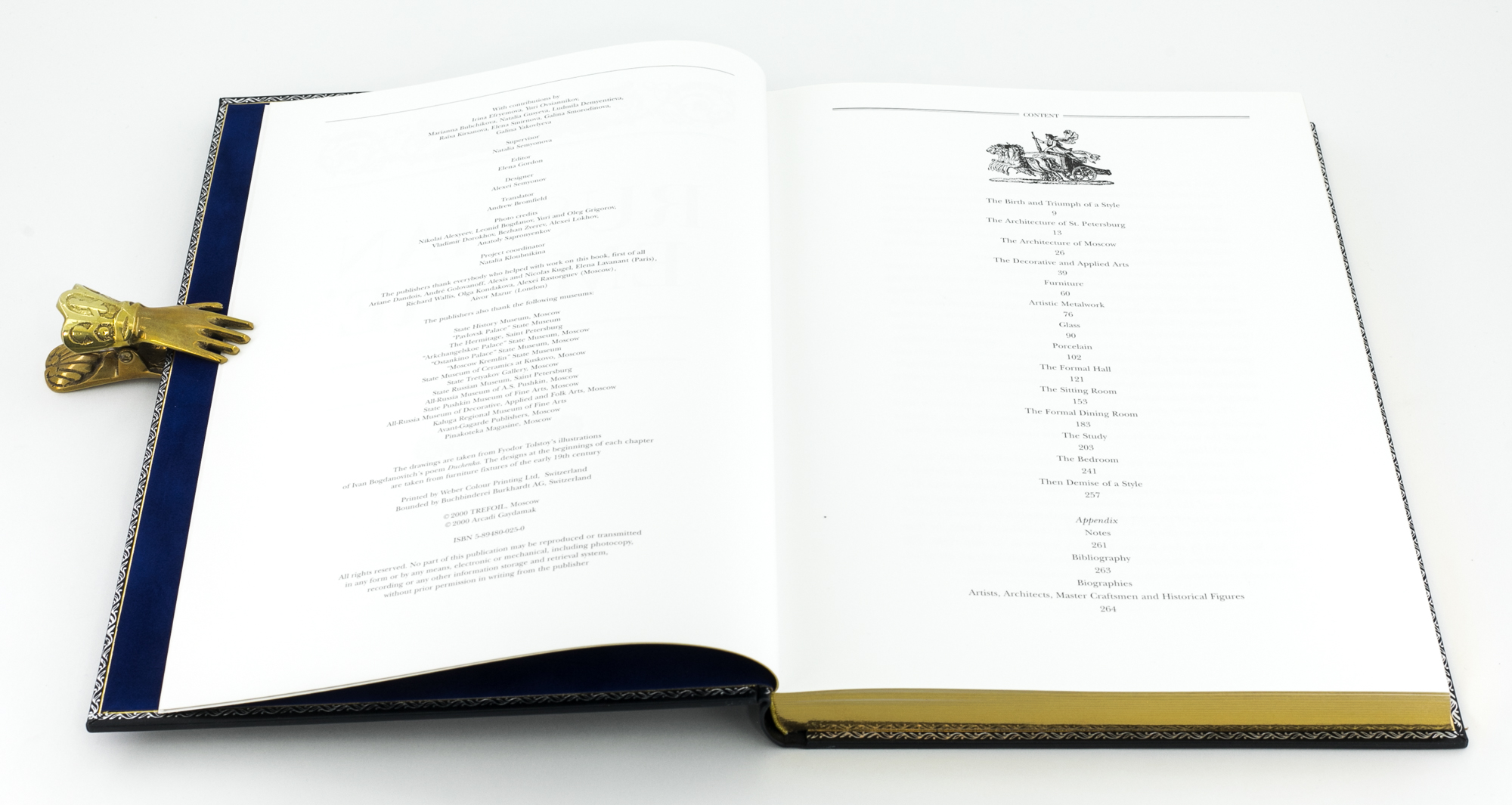 В богато иллюстрированном альбоме «Русский Ампир» отражено все многообразие проявления стиля в архитектуре, скульптуре и декоративной живописи, в искусстве создания ансамблей интерьеров, мебели и бронзе, фарфоре и стекле, серебре и светильниках, костюмах и тканях.