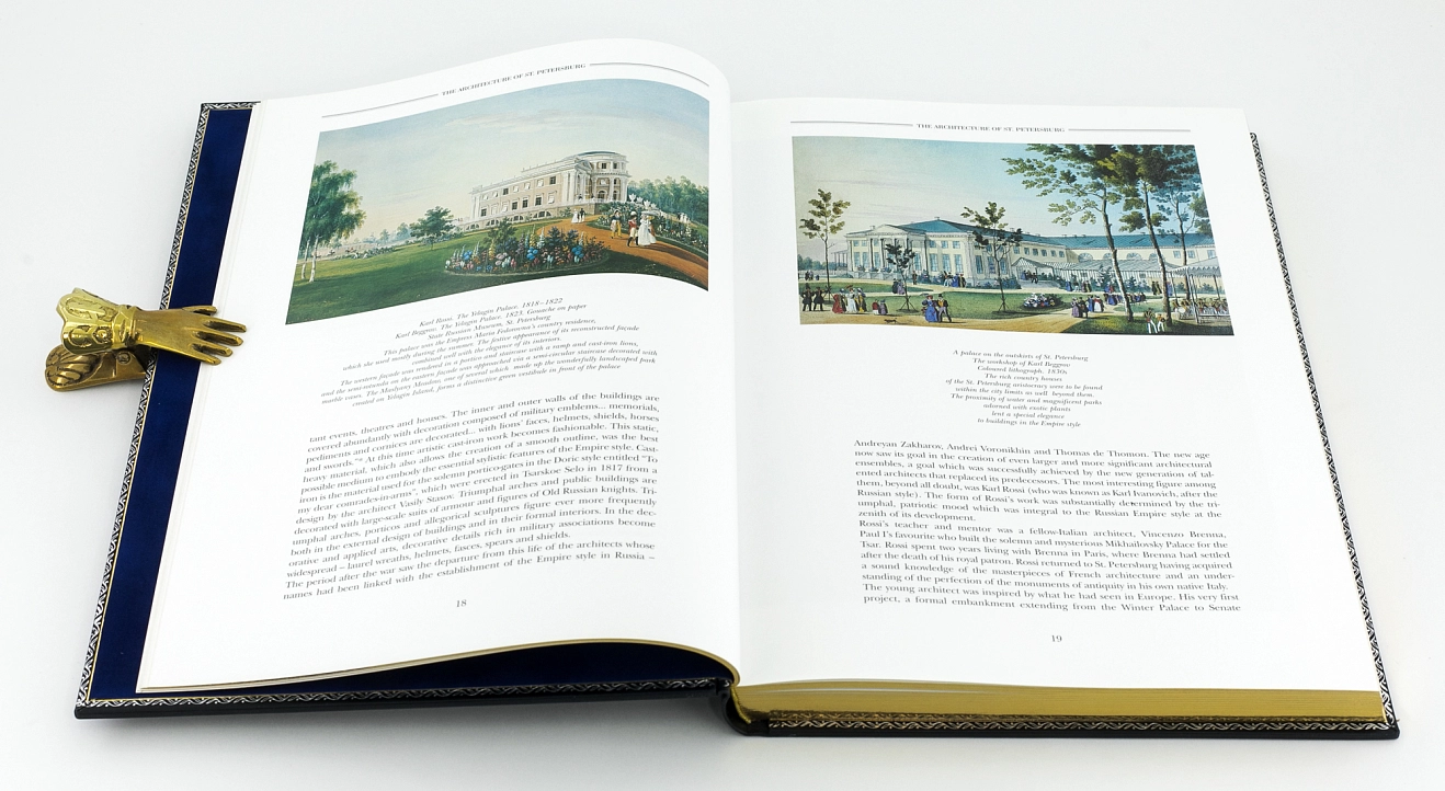 В богато иллюстрированном альбоме «Русский Ампир» отражено все многообразие проявления стиля в архитектуре, скульптуре и декоративной живописи, в искусстве создания ансамблей интерьеров, мебели и бронзе, фарфоре и стекле, серебре и светильниках, костюмах и тканях.