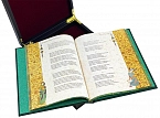 Дизайн прекрасно сочетает в себе золотое и блинтовое тиснение, художественную металлическую вставку, соответствующую тематике издания, а также крашенный в тон переплетного материала обрез.