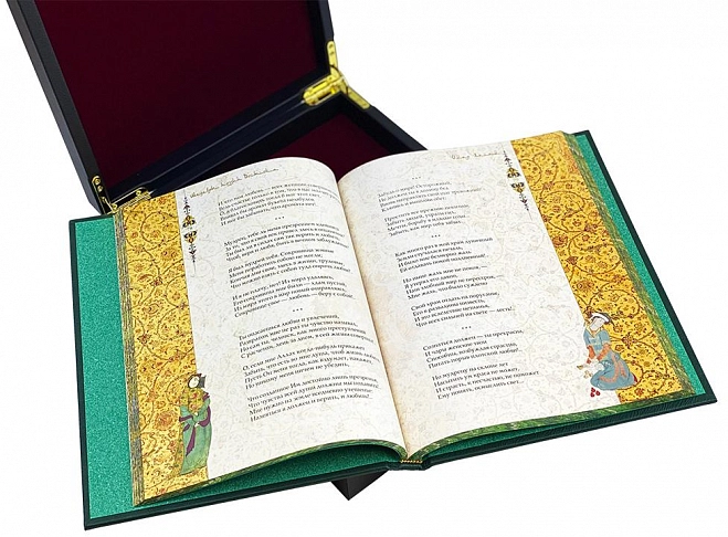 Подарочная книга "Шедевры поэзии Востока. Хайям, Руми, Саади" АННОТАЦИЯ Омар Хайям, Хафиз, Джалаладдин Руми и Саади - великие персидские поэты X-XIV веков, чьи имена наиболее известны в западном мире. Самый популярный в настоящее время, бесспорно, Омар Хайям (1048-1123). Математик, астроном, поэт и философ, он обладал всеми качествами универсального гения, но мировую известность ему принесли его персидские четверостишия - искрометные и отточенные рубай. Хафиз (ок. 1325-1389),певец роз и соловьев - самый знаменитый персидский поэт-лирик, оказавший значительное влияние на европейскую и русскую литературу: от Гёте и Пушкина до поэтов Серебряного века. Его газели по изяществу и художественности стиха считаются лучшими в персидской поэзии. Джалаладдин Руми (1207-1273) знаменит как прекрасный поэт, автор лирического Дивана и поэмы, Меснави, а также как суфий - один из величайших мистиков всех времен. Саади Ширазский (1203-1291) - один из любимых авторов исламского мира. Слова Саади, чудного выразителя истинно персидского духа, и сегодня у всех на устах как пословицы и крылатые изречения. Перелистайте страницы этой книги, и перед вами раскроется подлинная душа Востока! ОПИСАНИЕ Издание представлено в оригинальной подарочной коробке. Дизайн прекрасно сочетает в себе золотое и блинтовое тиснение, художественную металлическую вставку, соответствующую тематике издания, а также крашенный в тон переплетного материала обрез. Цельнокожаный переплет ручной работы. Высококачественная бумага, красочные иллюстрации, ляссе.