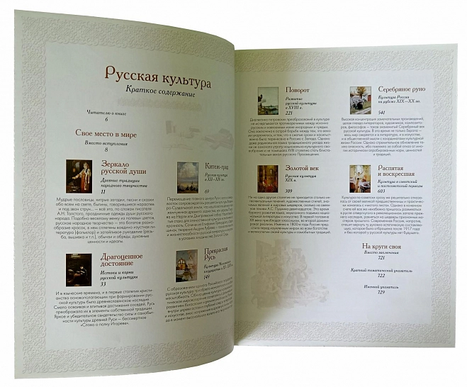 Настоящее издание дает редкую возможность войти в целостный мир русской культуры от древности до конца XX века, познакомиться с памятниками фольклора, литературы, зодчества, произведениями изобразительного искусства, примечательными страницами истории театра и кино. Разнообразный иллюстрированный материал позволяет получить наглядное представление о любом из упомянутых в тексте шедевров, увидеть портреты творцов русской культуры. В издании 750 рассказов, более 1000 имен деятелей культуры и 2000 иллюстраций. Книга рассчитана на широкий круг читателей и будет полезна всем, кто любит отечественную культуру и хочет лучше узнать ее историю.