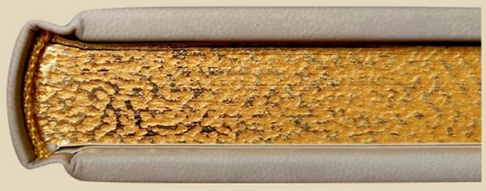 Переплет ручной работы. Натуральная переплетная кожа. Каптал из шелковых нитей. Ляссе шелковое. Обрез торшонированный золотой фольгой. Украшение переплета: тиснение полиграфической фольгой, полиграфическая вставка.