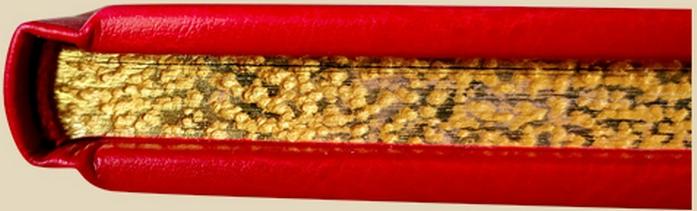 Переплет ручной работы. Натуральная переплетная кожа. Каптал из шелковых нитей. Ляссе шелковое. Обрез торшонированный золотой фольгой. Украшение переплета: тиснение полиграфической фольгой, полиграфическая вставка.