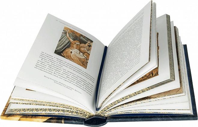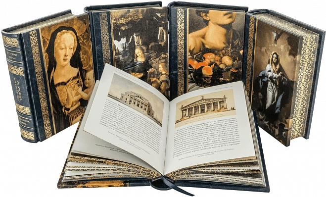 Подарочные книги "Сокровища Италии" Витторио Згарби в 5 томах ОФОРМЛЕНИЕ Составной переплет «Брадель» ручной работы выполнен из натуральной кожи «Robbat Blue» производства итальянской кожевенной фабрики «Benerichetti». Обложки декорированы вставками из холста с художественными репродукциями и рельефным золотым тиснением (фольга «Luxor 240»). Обрезы книжных блоков оформлены в авторской технике золочения с нанесением орнамента. Персональный сертификат с индивидуальным текстом поздравления. Бархатный мешочек. Деревянная коробка. Общее количество страниц – 2430 стр. Формат одной книги –155х215х50 мм. Вес одной книги – 1,5 кг. Вес комплекта – 7,5 кг. Готовые книги могут незначительно отличаться от представленных на фото. СОДЕРЖАНИЕ Предчувствие Ренессанса Переиздание первой книги Витторио Згарби из серии «Сокровища Италии». В ней автор знакомит со всеми этапам становления итальянского искусства вплоть до Ренессанса, рассказывая не только об именитых мастерах, но и о тех, чьи имена известны только искусствоведам, помогает увидеть в их творениях первые ростки нового подхода к изображению человека и окружающего мира. Скульптуры собора в Модене, барельефы Феррары, оформление баптистерия в Парме, певческие кафедры в соборах Пизы и Сиены, сицилийские мозаики, картины Беато Анджелико, Доменико Венециано, Пьеро делла Франческа – рассказ обо всем этом постепенно подводит к работам Джотто, Донателло и Мазаччо. «Предчувствие Ренессанса» – идеальное виртуальное путешествие захватывающему и незабываемому итальянскому искусству, прекрасному и волшебному, как сама Италия. Ренессанс Вторая книга из серии «Сокровища Италии». Книга посвящена самому яркому этапу в развитии искусства – периоду XV-XVI веков, известному, как Ренессанс. Увлекательный рассказ о художественных полотнах и фресках, об известных и незаслуженно забытых художниках. Сам автор называет Ренессанс эпохой чудес, когда художники от работы к работе превосходили самих себя. Это время Мантеньи, Боттичелли, Леонардо, Рафаэля, Микеланджело, Джованни Беллини, Тициана. Книга наполнена знаменитыми шедеврами эпохи Возрождения, а также рассказывает о недавних открытиях, еще не ставших всеобщим достоянием. От Микеланджело до Караваджо Третья книга в серии ""Сокровища Италии"" знаменитого историка и искусствоведа Витторио Згарби рассказывает о постренессансной эпохе. В европейском искусстве наступает время перемен: маньеризм и барокко рвутся вперед, а художники переходят к реалистическому изображению жизни. Книга «От Микеланджело до Караваджо» в буквальном смысле путь с небес на землю. От внутренних метаний до постепенного проявления верности земному. На этом пути особое место занимают художники, обладающие глубоким чувством и пониманием людей и вещей: Тициан, Лоренцо Лотто, Веронезе, Тинторетто и, в первую очередь, Бассано. Целый век поисков и экспериментов после Рафаэля. Небо и земля то и дело меняются местами, пока наконец правда жизни окончательно не восторжествует в творчестве Караваджо. От Караваджо до Тьеполо Четвертая книга из серии «Сокровища Италии» посвящена эпохе барокко. Автор, не изменяя своей свободной манере повествования, заново открывает читателям творчество как великих итальянских мастеров, так и несправедливо забытых. «Мне казалось, я знаю, что такое Италия, но я ошибал