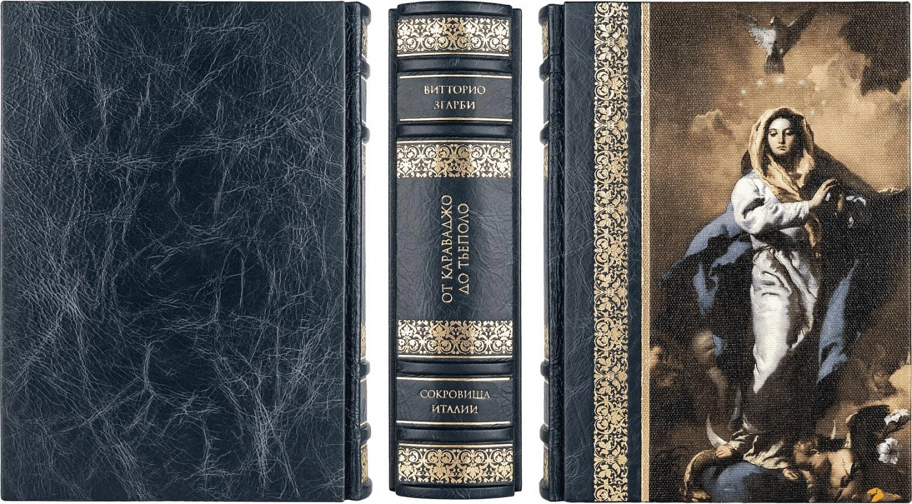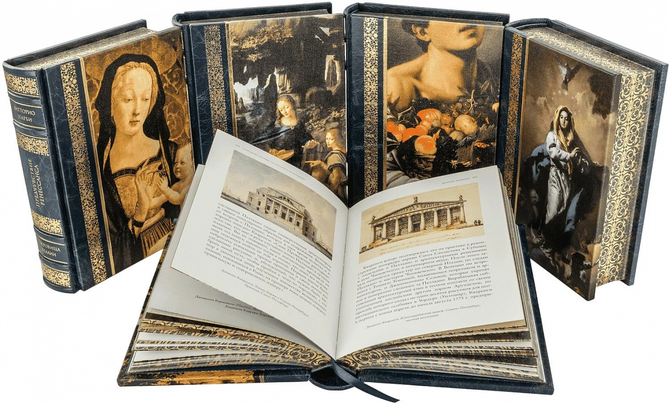 Подарочные книги "Сокровища Италии" Витторио Згарби в 5 томах ОФОРМЛЕНИЕ Составной переплет «Брадель» ручной работы выполнен из натуральной кожи «Robbat Blue» производства итальянской кожевенной фабрики «Benerichetti». Обложки декорированы вставками из холста с художественными репродукциями и рельефным золотым тиснением (фольга «Luxor 240»). Обрезы книжных блоков оформлены в авторской технике золочения с нанесением орнамента. Персональный сертификат с индивидуальным текстом поздравления. Бархатный мешочек. Деревянная коробка. Общее количество страниц – 2430 стр. Формат одной книги –155х215х50 мм. Вес одной книги – 1,5 кг. Вес комплекта – 7,5 кг. Готовые книги могут незначительно отличаться от представленных на фото. СОДЕРЖАНИЕ Предчувствие Ренессанса Переиздание первой книги Витторио Згарби из серии «Сокровища Италии». В ней автор знакомит со всеми этапам становления итальянского искусства вплоть до Ренессанса, рассказывая не только об именитых мастерах, но и о тех, чьи имена известны только искусствоведам, помогает увидеть в их творениях первые ростки нового подхода к изображению человека и окружающего мира. Скульптуры собора в Модене, барельефы Феррары, оформление баптистерия в Парме, певческие кафедры в соборах Пизы и Сиены, сицилийские мозаики, картины Беато Анджелико, Доменико Венециано, Пьеро делла Франческа – рассказ обо всем этом постепенно подводит к работам Джотто, Донателло и Мазаччо. «Предчувствие Ренессанса» – идеальное виртуальное путешествие захватывающему и незабываемому итальянскому искусству, прекрасному и волшебному, как сама Италия. Ренессанс Вторая книга из серии «Сокровища Италии». Книга посвящена самому яркому этапу в развитии искусства – периоду XV-XVI веков, известному, как Ренессанс. Увлекательный рассказ о художественных полотнах и фресках, об известных и незаслуженно забытых художниках. Сам автор называет Ренессанс эпохой чудес, когда художники от работы к работе превосходили самих себя. Это время Мантеньи, Боттичелли, Леонардо, Рафаэля, Микеланджело, Джованни Беллини, Тициана. Книга наполнена знаменитыми шедеврами эпохи Возрождения, а также рассказывает о недавних открытиях, еще не ставших всеобщим достоянием. От Микеланджело до Караваджо Третья книга в серии ""Сокровища Италии"" знаменитого историка и искусствоведа Витторио Згарби рассказывает о постренессансной эпохе. В европейском искусстве наступает время перемен: маньеризм и барокко рвутся вперед, а художники переходят к реалистическому изображению жизни. Книга «От Микеланджело до Караваджо» в буквальном смысле путь с небес на землю. От внутренних метаний до постепенного проявления верности земному. На этом пути особое место занимают художники, обладающие глубоким чувством и пониманием людей и вещей: Тициан, Лоренцо Лотто, Веронезе, Тинторетто и, в первую очередь, Бассано. Целый век поисков и экспериментов после Рафаэля. Небо и земля то и дело меняются местами, пока наконец правда жизни окончательно не восторжествует в творчестве Караваджо. От Караваджо до Тьеполо Четвертая книга из серии «Сокровища Италии» посвящена эпохе барокко. Автор, не изменяя своей свободной манере повествования, заново открывает читателям творчество как великих итальянских мастеров, так и несправедливо забытых. «Мне казалось, я знаю, что такое Италия, но я ошибал