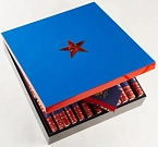Серия из 50 книг в составном переплете из ткани и натуральной кожи с золотым тиснением. Лакированный деревянный короб украшен звездой из золота с эмалью.