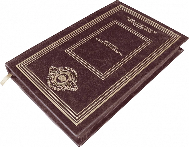 Составной переплет «Брадель», ручной работы, выполнен из натуральной кожи «Robbatmarrone» производства итальянской кожевенной фабрики «Carisma». Обложка книги декорирована рельефным матовым золотым тиснением (использована фольга «Luxor 240»). Обрез книги вручную полирован и позолочен.