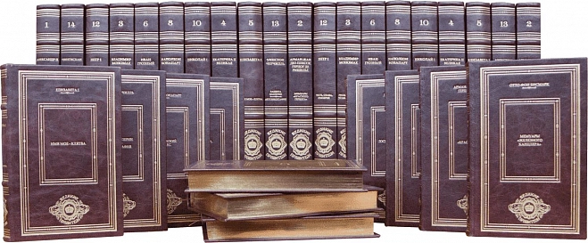 По желанию клиента на заднюю обложку каждого тома может быть оттеснена семейная монограмма (суперэкслибрис), что переводит собрание в разряд фамильной библиотеки, которая будет передаваться из поколения в поколение.