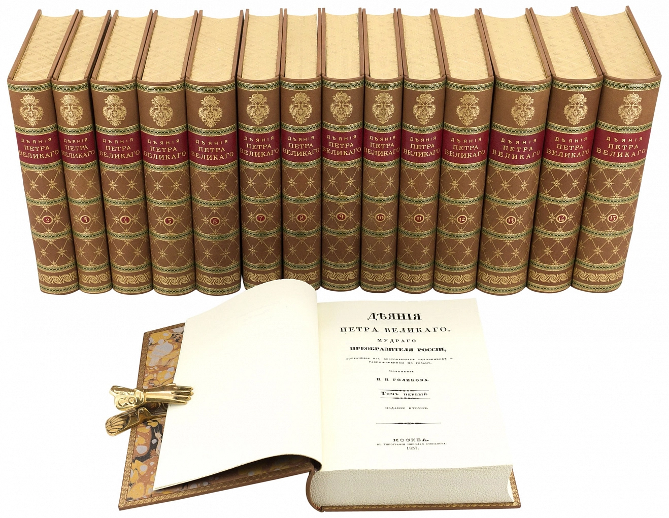 Сочинение российского историка Ивана Ивановича Голикова. В 15-ти томах Москва. Тип. Н. Степанова 1837 г. Репринт: Москва. 2011. Эксклюзивное, коллекционное. Тираж 10 номерных экземпляров.