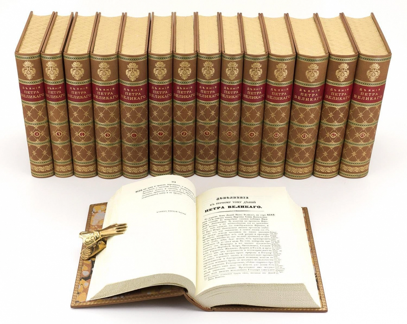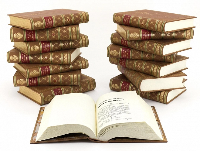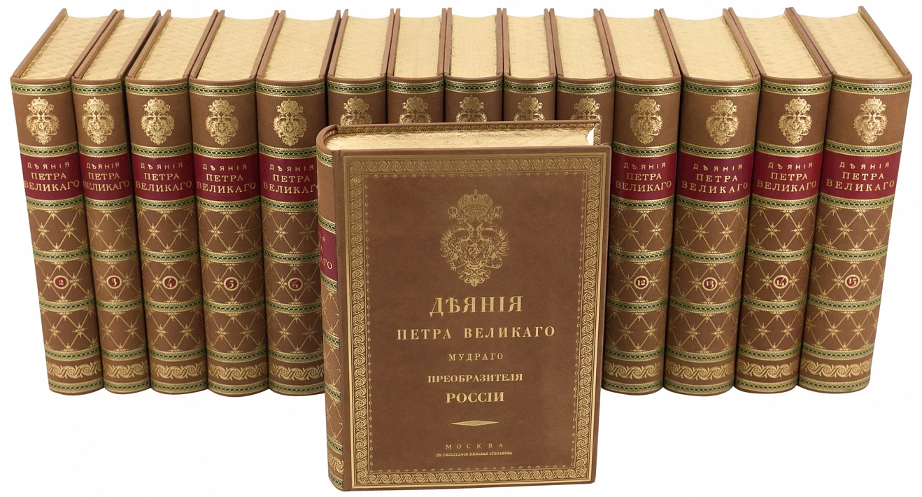 ДЕЯНИЯ ПЕТРА ВЕЛИКОГО, МУДРОГО ПРЕОБРАЗИТЕЛЯ РОССИИ, СОБРАННЫЕ ИЗ ДОСТОВЕРНЫХ ИСТОЧНИКОВ И РАСПОЛОЖЕННЫЕ ПО ГОДАМ АННОТАЦИЯ Сочинение российского историка Ивана Ивановича Голикова. В 15-ти томах Москва. Тип. Н. Степанова 1837 г. Репринт: Москва. 2011. Эксклюзивное, коллекционное. Тираж 10 номерных экземпляров. В основе этого монументального труда лежат полторы тысячи книг о деятельности Петра Первого, в том числе рукописные записки полкового священника при Петре, который был очевидцем многих событий той эпохи. «Деяния» использовал Пушкин в процессе работы над «Историей Петра». ОФОРМЛЕНИЕ Бумага кремовый «верже» из коллекции «Corolla book» компании «Fedrigoni» (Италия); Переплет цельнокожаный, из натуральной кожи (Франция); Переплет выполнен по классической старинной технологии, блок сшит на четырех шнурах; Тиснение золотом на переплете и корешке; Инкрустация корешка; Форзац составной, из бумаги ручного крашения; Ляссе шелковое, каптал ручного плетения; Ручная окраска и гравировка обрезов. Издание включает 15 томов.