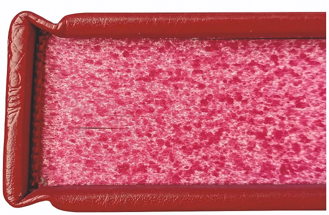 Переплет ручной работы. Натуральная переплетная кожа. Каптал из шелковых нитей. Ляссе шелковое. Обрез окрашенный. Украшение переплета: тиснение полиграфической фольгой, конгревное тиснение.