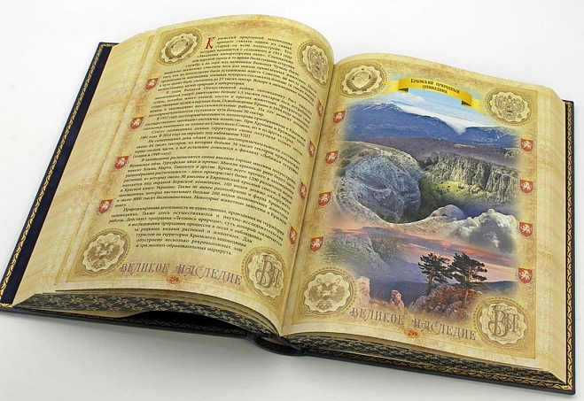 КРЫМ, ПОДАРОЧНАЯ КНИГА В КОЖАНОМ ПЕРЕПЛЕТЕ АННОТАЦИЯ Том "Крым" серии книг "Великое наследие" посвящен красивейшему и древнему полуострову. В нем вы найдете интересную информацию и красочные иллюстрации, а также фотографии, иллюстрирующие основные страницы истории Крыма Подарочная книга "Крым" предлагает уникальный и всесторонний обзор региона, обогащенный архивными материалами, фотографиями и исследованиями. Книга расширит ваше представление о Крыме и поможет вам проникнуться его богатой историей.. ОФОРМЛЕНИЕ Французский стиль кожаного переплета, блинтовое, цветное и рельефное тиснение. Отпечатана на мелованной бумаге производства Италия. Книжный блок отшлифован и тонирован с нанесением орнамента золотой фольгой. Индивидуальный дизайн оформления. Полностью ручная работа, ограниченный тираж. Поставляется в коробе аналогичного дизайна.