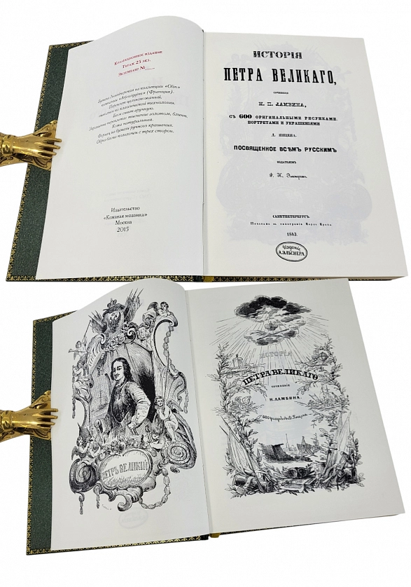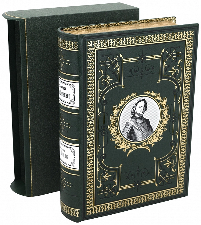 Подарочная книга "История Петра Великого" Ламбин Н.П.,Репринтное издание, 1843 г АННОТАЦИЯ Издание является коллекционным. Это прекрасный подарок для ценителей русской истории. Репринтное издание, 1843 г Москва. 2015г. Тираж 100 номерных экземпляров. ОПИСАНИЕ - Классический французский переплет на шнурах, из натуральной кожи Шагрень (пр-во Франция); - Комбинированное тиснение обложки и корешка; - Вставки из цветной кожи на обложке и корешке; - Форзац из мраморной бумаги ручного крашения; - Обрез с трёх сторон окрашен и гравирован вручную; - Дублюра украшена золотым орнаментом; - Формат 18,5 х 25,5 см; - Книга вложена в индивидуальный футляр из дизайнерской бумаги с кожаной окантовкой.