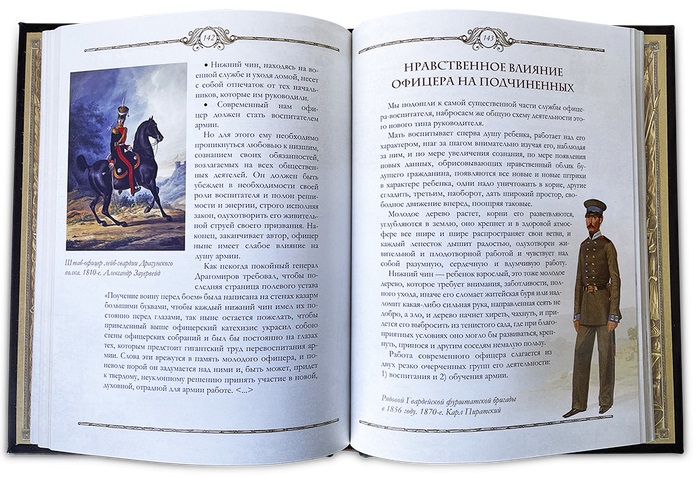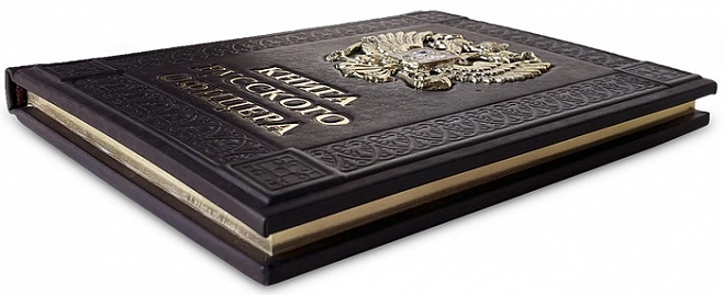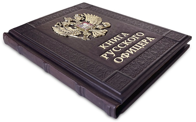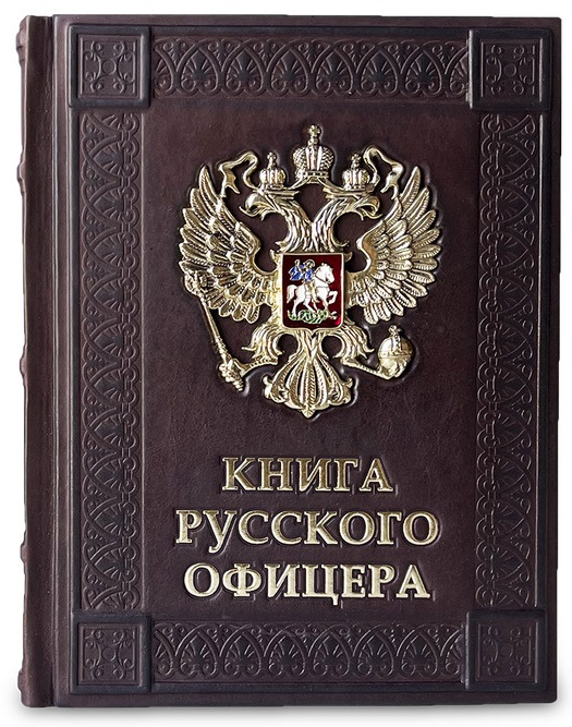 Подарочная книга "Книга русского офицера" АННОТАЦИЯ Главными книгами с неофициальным статусом кодекса чести русского офицера стали работа ротмистра В. Кульчиткого, его «Советы офицера» вошли в основу кодекса Советской гвардии и дуэльный кодекс В. Дурасова, основанный на представлении об офицерской чести в Российской Империи. Также в сборник вошли записки о нормах и правилах поведения начальствующего состава в полковой и бытовой жизни. ОПИСАНИЕ Подарочное издание в переплете ручной работы из натуральной кожи с трехсторонним золотым обрезом. Книга оформлена художественным литьем ручной работы, расписанное цветными эмалями вручную. Книга напечатана на мелованной бумаге с цветными иллюстрациями.