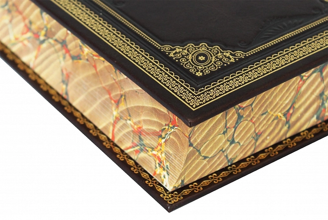 Цельнокожаный переплёт ручной работы, украшен цветной кожаной вставкой, а также золотым и блинтовым тиснением. Корешок декорирован бинтами. Текст книги напечатан на бумаге Palatina Avorio 100 Австрийского производства. Обрез оформлен в технике "Перо павлина". Ляссе из шёлковой ленты. Форзац цельный из дизайнерской бумаги. Дублюра окатана золотом.