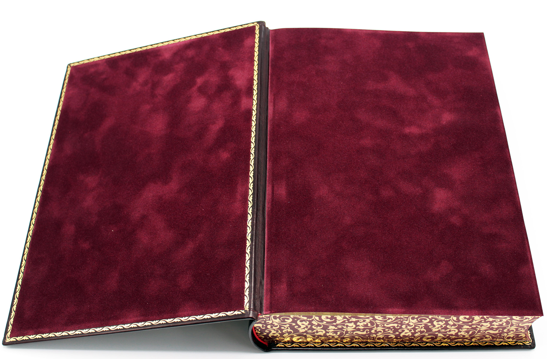 Исторический французский стиль переплета, рельефное тиснение по коже цветное и блинтовое, книжный блок отшлифован и тонирован с нанесением русского орнамента золотом.