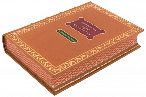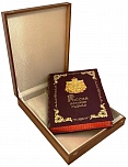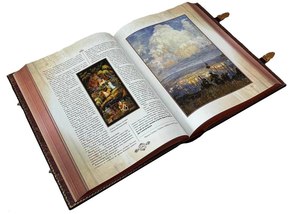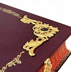 Подарочная книга "Россия. Великая судьба" (эксклюзивное издание) АННОТАЦИЯ Книга представляет философское осмысление исторического развития России и русского народа при взгляде из современной эпохи. Представлен весь ход российской истории с древнейших времен до наших дней. Нестандартные гипотезы и выводы автора подкреплены многочисленными цитатами из русских летописей, малоизвестными историческими документами, красочными свидетельствами современников. Книга содержит сотни цветных иллюстраций, включая произведения живописи. Книга ценна огромным количеством редкой информации, которая необходима для глубокого понимания истории нашей страны. ОПИСАНИЕ Французский цельнокожаный переплет ручной работы на шнурах.. Форзац составной из мраморной бумаги на кожаной слизуре. Каптал двойной наборный, ручное плетение из шелковых нитей. Обрез окрашенный с тиснением золотой фольгой. Переплет украшен ювелирным литьем из латуни, покрытым золотом 24 Кт., и декорированный кабошонами из натурального граната и холодными эмалями.