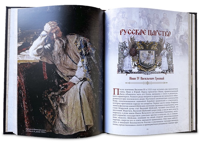 Подарочная книга "Великая Россия. 1000 лет истории" АННОТАЦИЯ Книга о тысячелетней истории России от основателей правящей династии Рюрика до Российской империи начала XX века, содержит труды величайших историков, таких как Карамзин, Ломоносов, Ключевский, Костомаров, Ключевский и др. Издание иллюстрировано произведениями классической живописи. ОПИСАНИЕ Подарочное издание в переплете ручной работы из натуральной кожи с трехсторонним золотым обрезом. Книга оформлена объёмной 3D художественной вставкой из натуральной кожи с цветной фотопечатью. Книга напечатана на дизайнерской мелованной бумаге с цветными иллюстрациями.
