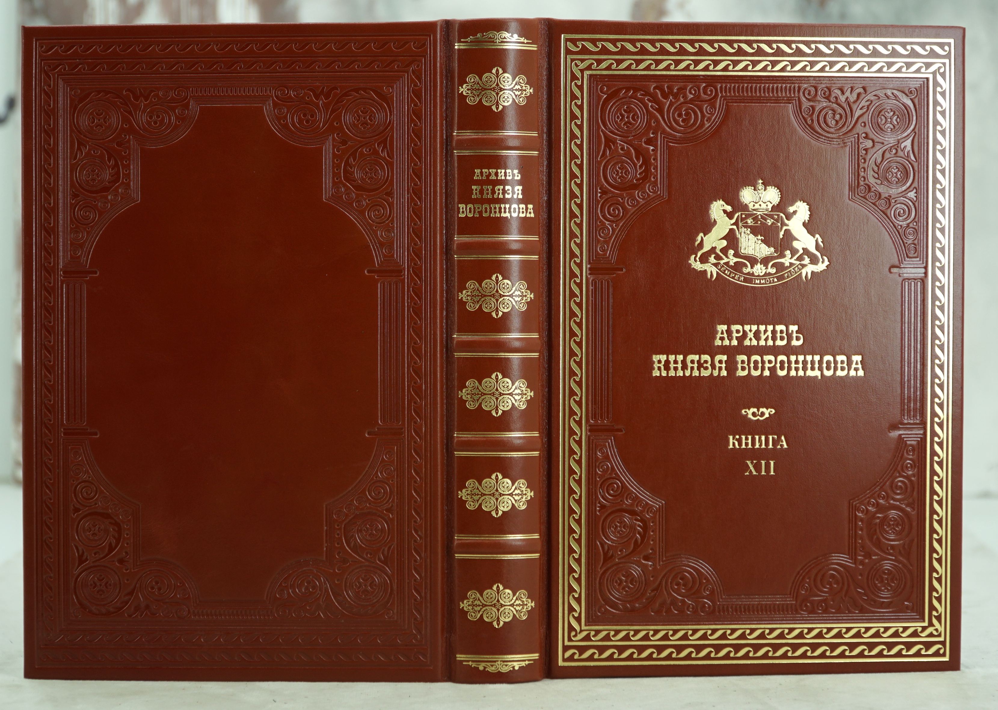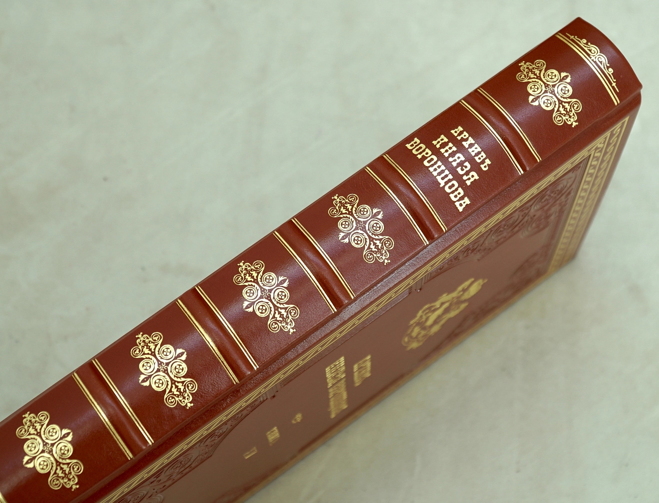 Каждый из 40 томов этого репринтного издания облачен в роскошный, цельнокожаный переплет ручной работы. Авторский дизайн проявляется в изысканном сочетании блинтового тиснения и тиснения золотой фольгой ( Производства немецкой фирмы KURZ). Элегантность издания подчеркивают 5 бинтов на корешке, а также торшонированные обрезы книжного блока вручную оформлены изысканным золотым напылением. Книжные блоки напечатаны на бумаге премиального качества и сшиты вручную с дополнительной проклеейкой корешка блока. В дизайне переплета для придания аутентичности оттиснен фамильный герб рода Воронцовых.