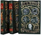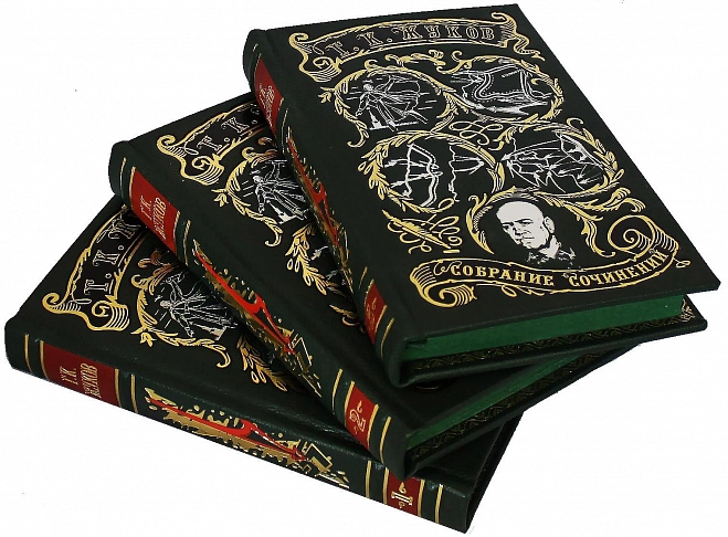 Богато оформленное собрание, представлено в подарочном издании. Цельнокожаный переплёт из натуральной шагрени, ручной работы, украшен цветной кожаной вставкой, а также серебряным