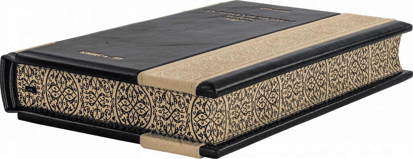 Составной переплет «Брадель», ручной работы, выполнен из комбинации натуральных кож (кожа «Marone Marine», кожа «Distesa bianca» производства итальянской кожевенной фабрики «Carisma»). Обложки книг двухуровневые, оформлены многоуровневым тиснением: глубоким блинтовым и рельефным золотым, с использованием фольги «Luxor 240». Обрезы книг выполнены в авторской технике позолоты с нанесением орнамента. Внутреннее убранство футляра устлано итальянским коттон-бархатом.